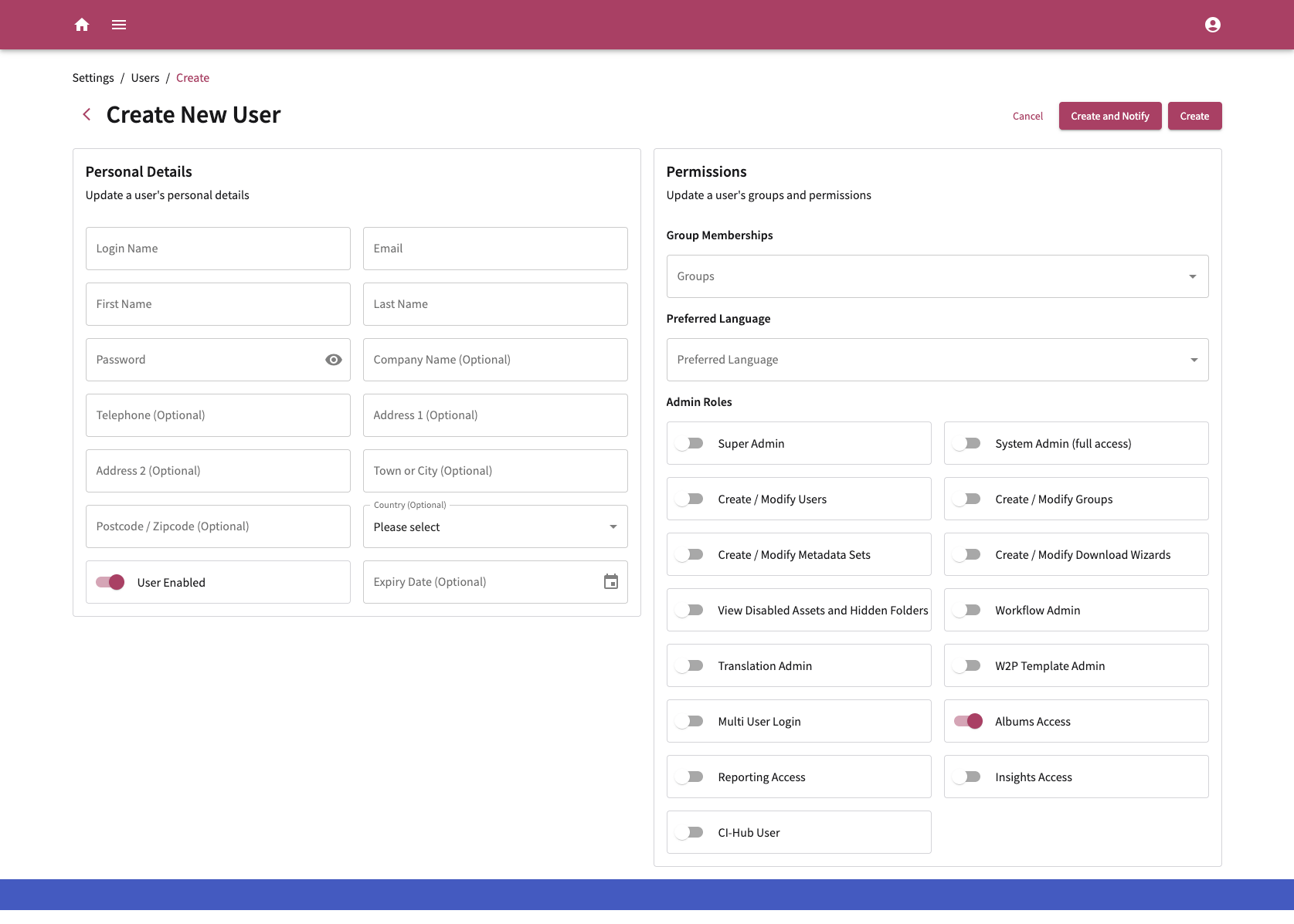All users must belong to at least one group and can belong to more than one group. The group permissions control what folders/areas in the system they have access to, and whether they can upload assets, create new folders, delete assets/folders, and modify them. For more information on this, please refer to the Groups help page.