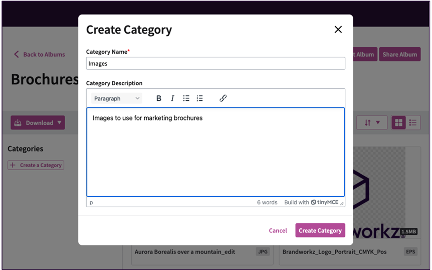 Then in the “Create Category” popup, enter the name of the category and provide a description if you want to give your audience more information about the assets in the category. Once you’ve created your first category, you can begin moving assets into the category.