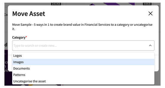 - From the pop-up, click on the “Category” dropdown menu to select the category where you want to put the asset and click “Save”.