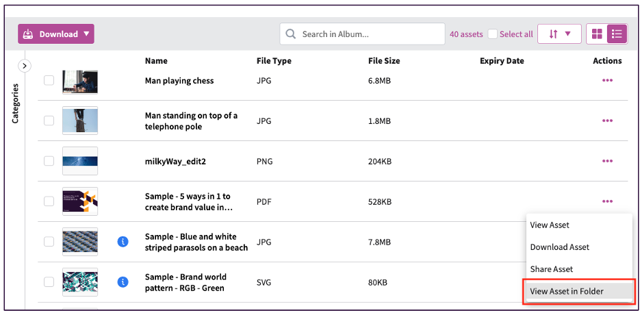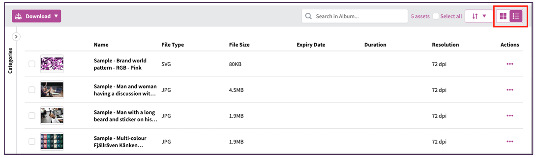 You can now view assets in albums in table view, which presents all the thumbnails and along with their layout toggle available to anyone with access to the album that allows them to view the assets in the album in a table layout, where all assets are displayed with all the information pertaining to the assets listed in the following columns: