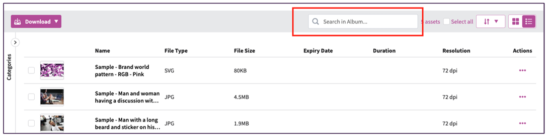 Albums now have with a search field in the header of the page that allow anyone with access it to search based on the asset name and get results as you type.