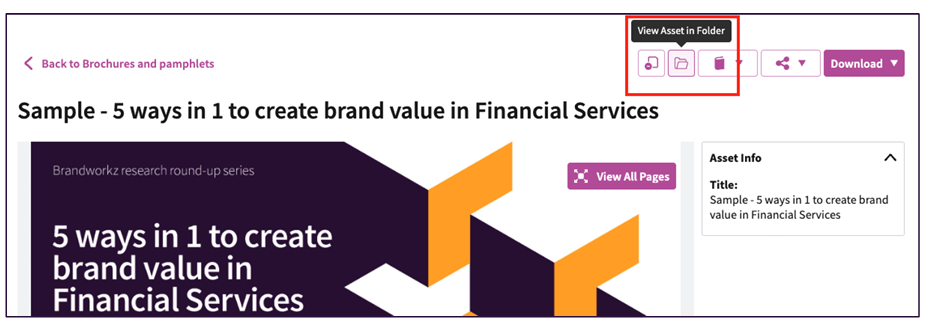 - Via the Asset Large Preview screen and clicking the “View Asset in Folder” button: