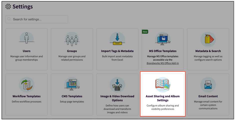 As we optimise the technology used for our Settings area, we have moved the settings relating to sharing assets and albums from the “Preferences” area into the new “Asset Sharing and Album Settings” area.