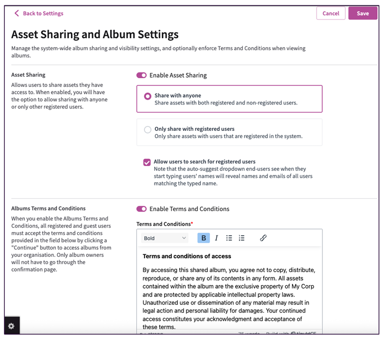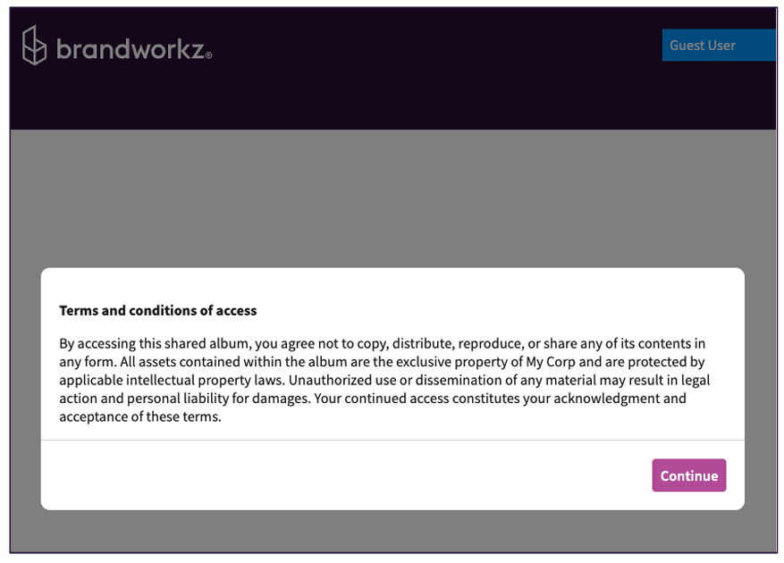 The new “Albums Terms and Conditions” option allows admins to require all registered users and guest users to view a pop-up with text and click “Continue” before viewing any assets or links that have been shared with them. When this option is activated, the Terms and Conditions pop-up will be shown for all albums and assets that are shared with anyone inside or outside your organisation.